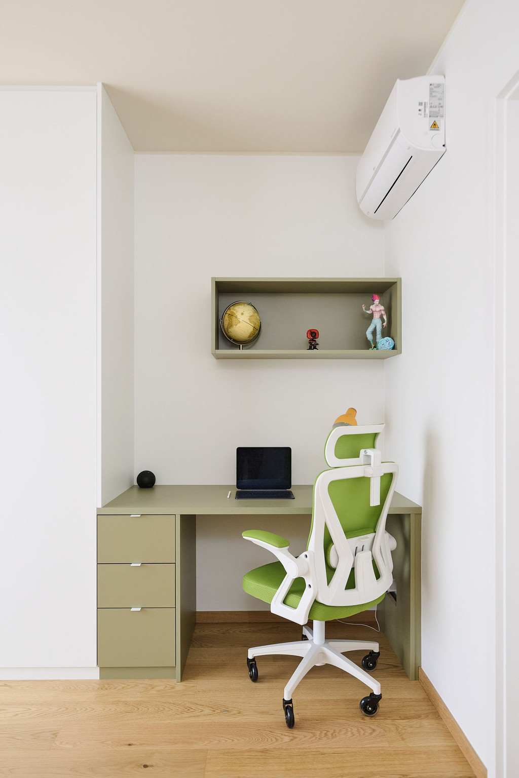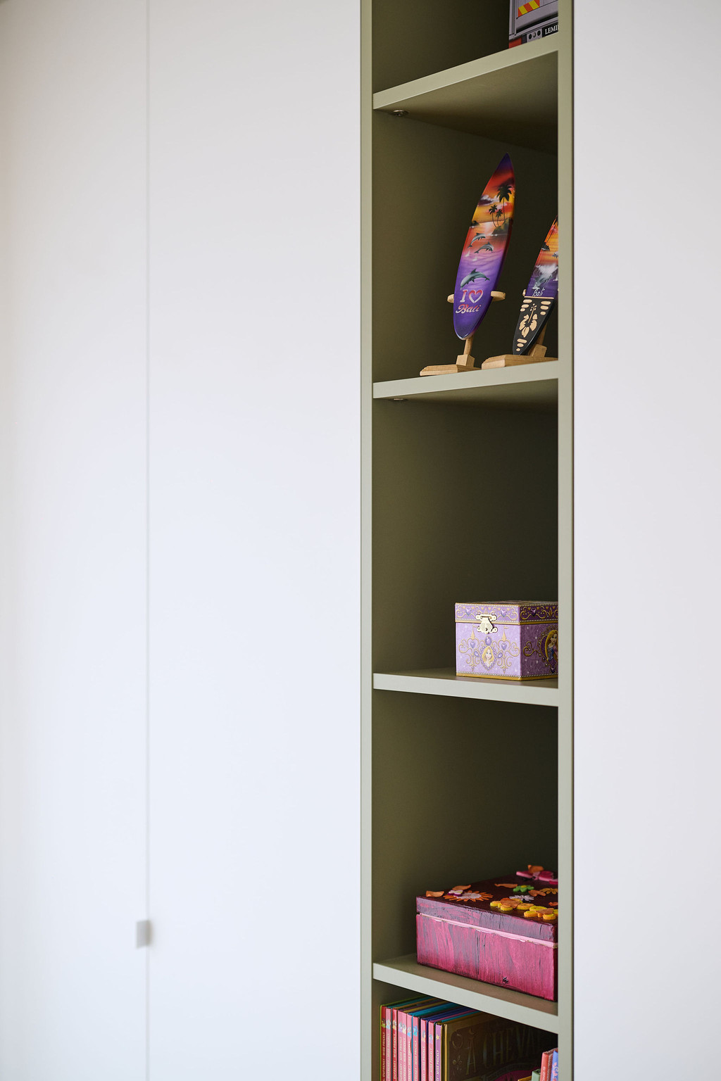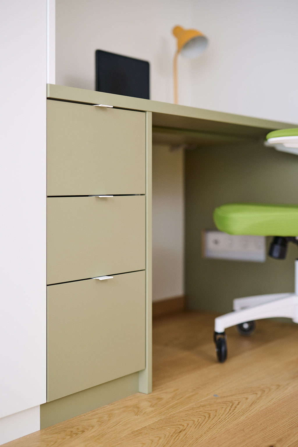 Bureau vert olive sur mesure avec placard blancBureau vert olive sur mesure avec placard blanc