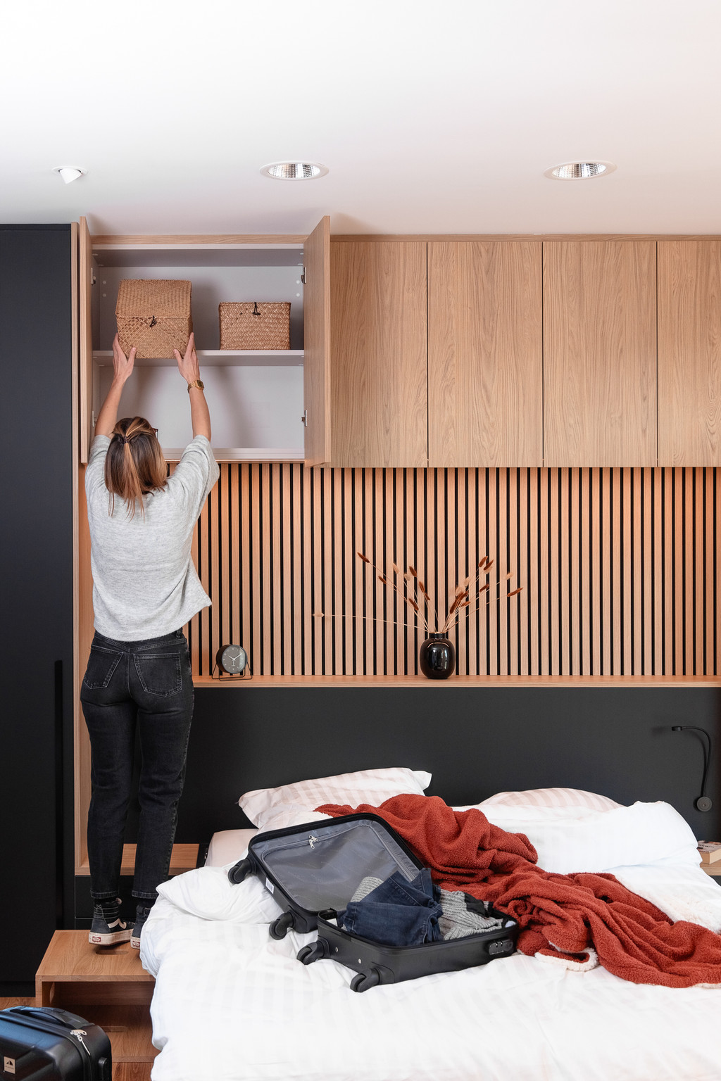 Chez Camber, le pont de lit avec rangements intégrés est parfait pour exploiter l’espace au-dessus de votre tête de lit. Ces placards hauts, conçus sur mesure, permettent de ranger sacs de voyage, draps ou vêtements saisonniers. Fini le désordre visuel : chaque objet trouve sa place dans une solution pratique, esthétique et discrète. Le tout accessible facilement, sans compromettre l’harmonie de votre chambre.