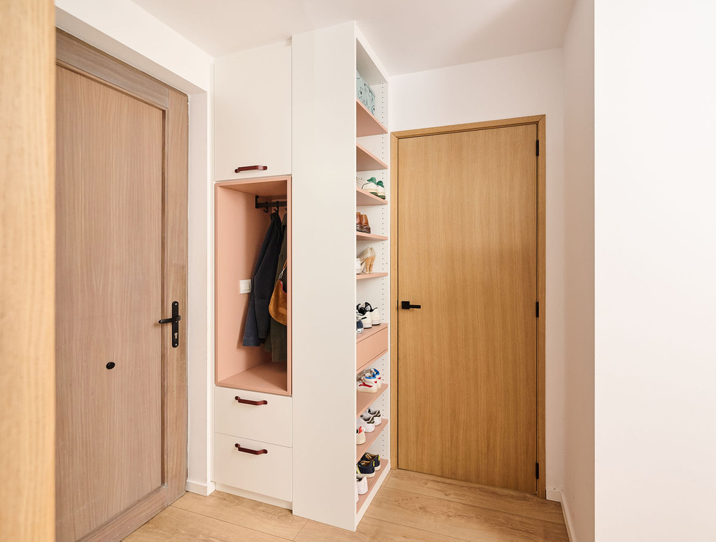 Een lichte, rustige kleurenbasis met een speels kleuraccent maakt van deze vestiairekast een blikvanger in de inkomhal.