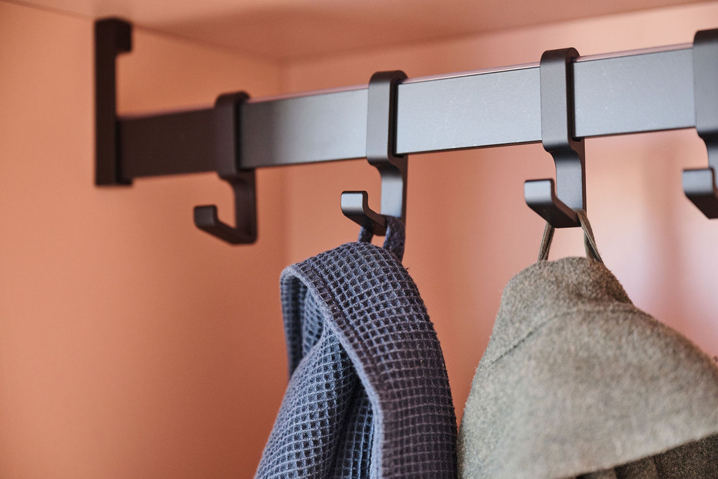 Camber-interieurarchitecte Nikki ontwierp een praktische vestiairekast op maat waarin het gezin al hun jassen, schoenen en accessoires overzichtelijk kan opbergen.
